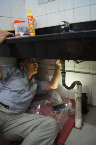 “我們服務(wù)搞得好一點(diǎn),租戶(hù)就租得時(shí)間長(zhǎng)一點(diǎn),集團(tuán)的利益就能多保障一點(diǎn)?!?br /> 7月6日下午2時(shí),在順河街一處網(wǎng)點(diǎn)房的洗手間里,54歲的唐建民斜倚在地上,費(fèi)力地將頭伸入洗手盆的下面,維修壞掉的下水管道。當(dāng)天,室內(nèi)溫度大約在35攝氏度左右,狹小無(wú)窗的洗手間溫度更高。在手機(jī)手電筒微弱的光線下,唐建民認(rèn)真地工作著,難聞的味道與難耐的高溫仿佛對(duì)他沒(méi)有影響——如果忽略不停滴落的汗水的話。