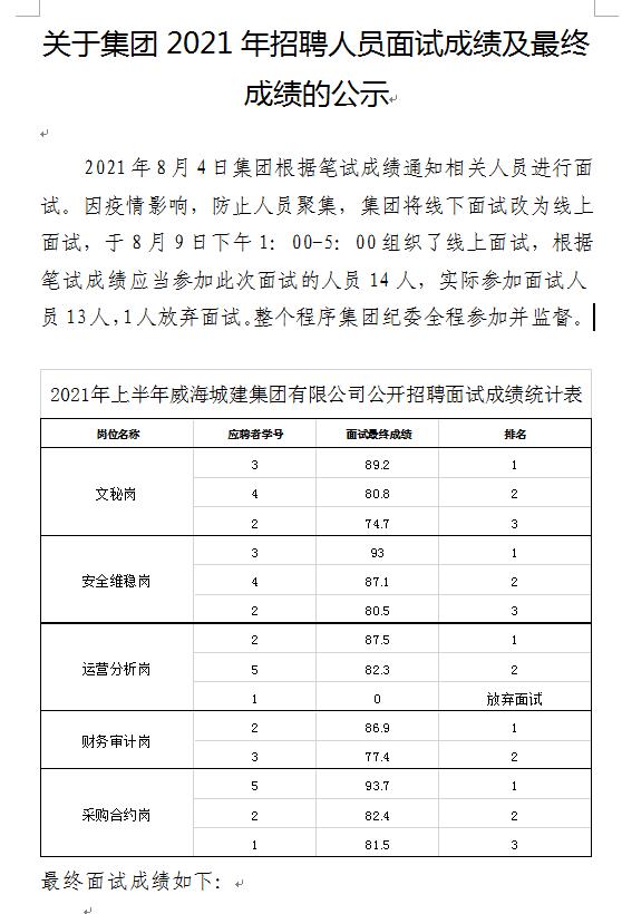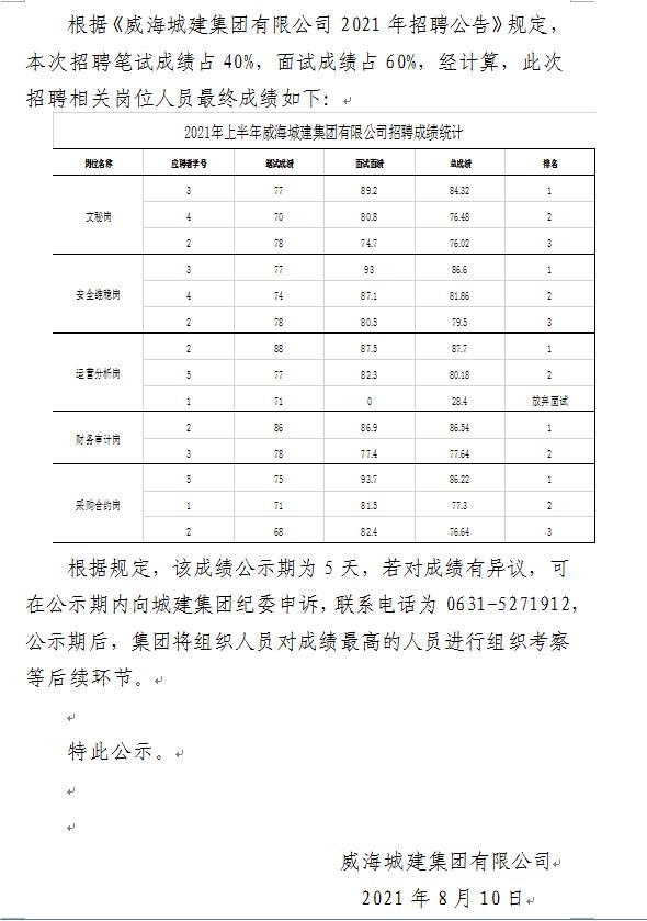 威海城建集團2021年招聘人員面試成績及最終成績的公示
